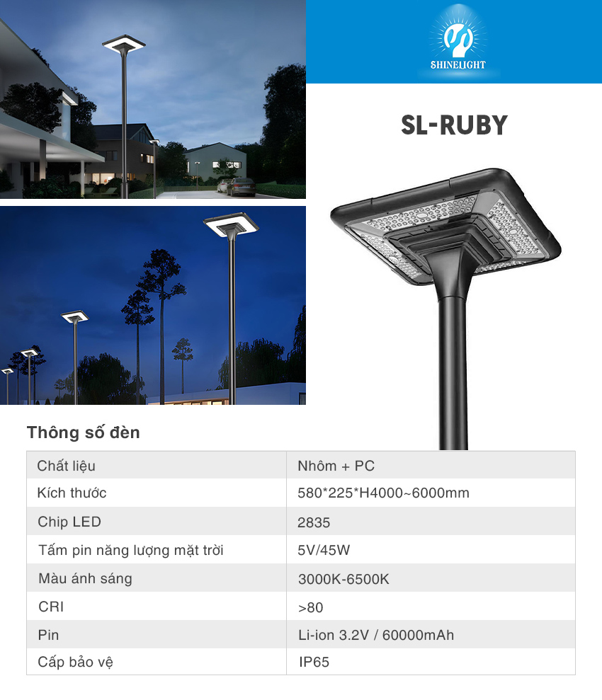 Đèn năng lượng mặt trời SL – RUBY là loại đèn được sử dụng tấm pin MONO và lắp trên cột thép hoặc cột nhôm có chiều cao từ 4m-6m , với thiết kế hình vuông và có nhiều chi tiết dập khuôn mang dáng vẻ hiện đại, đèn năng lượng mặt trời được sử dụng tấm pin Mono loại pin cao cấp cho thời lượng sạc pin nhanh hơn các loại pin thông thường, và có thời gian sáng lâu hơn với các loại pin khác. Đèn NLMT SL – RUBY không chỉ làm không gian đẹp hơn vào ban ngày, mà nó làm cho khu cảnh quan của bạn sang trọng hơn khi về đêm.