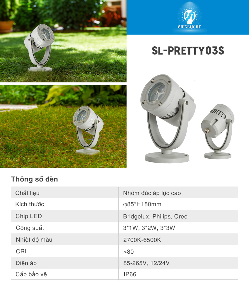 Đèn led chiếu cây có tác dụng chiếu hắt gốc cây giúp những cây xanh trong khu vườn trở nên đẹp và nổi bật hơn. Ngoài ra, đèn còn giúp chiếu sáng lối đi, mở rộng không gian và tầm nhìn của con người trong đêm tối. Với mẫu SL-Pretty03S có sử lựa chọn cho nhiều công suất khác nhau, tùy theo ý tưởng chiếu sáng của kiến trúc sư, với dải công suất : 3w – 6w – 9w là sự lựa chọn tối ưu cho những cây có tán rộng chiều cao dưới 2m cho hiệu quả ánh sáng đẹp nhất.