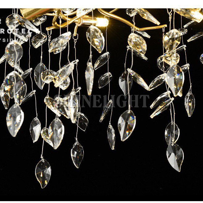 Hệ thống hạt phale được bố trí dày đặc quanh chụp đèn, khúc xạ ánh sáng từ các bóng G9 thành những tia sáng lung linh, lấp lánh như dải sao trên trần nhà. Mỗi viên phale được mài cắt kỹ lưỡng, trong suốt, bắt sáng tốt, tạo nên điểm nhấn tinh xảo cho toàn bộ không gian.