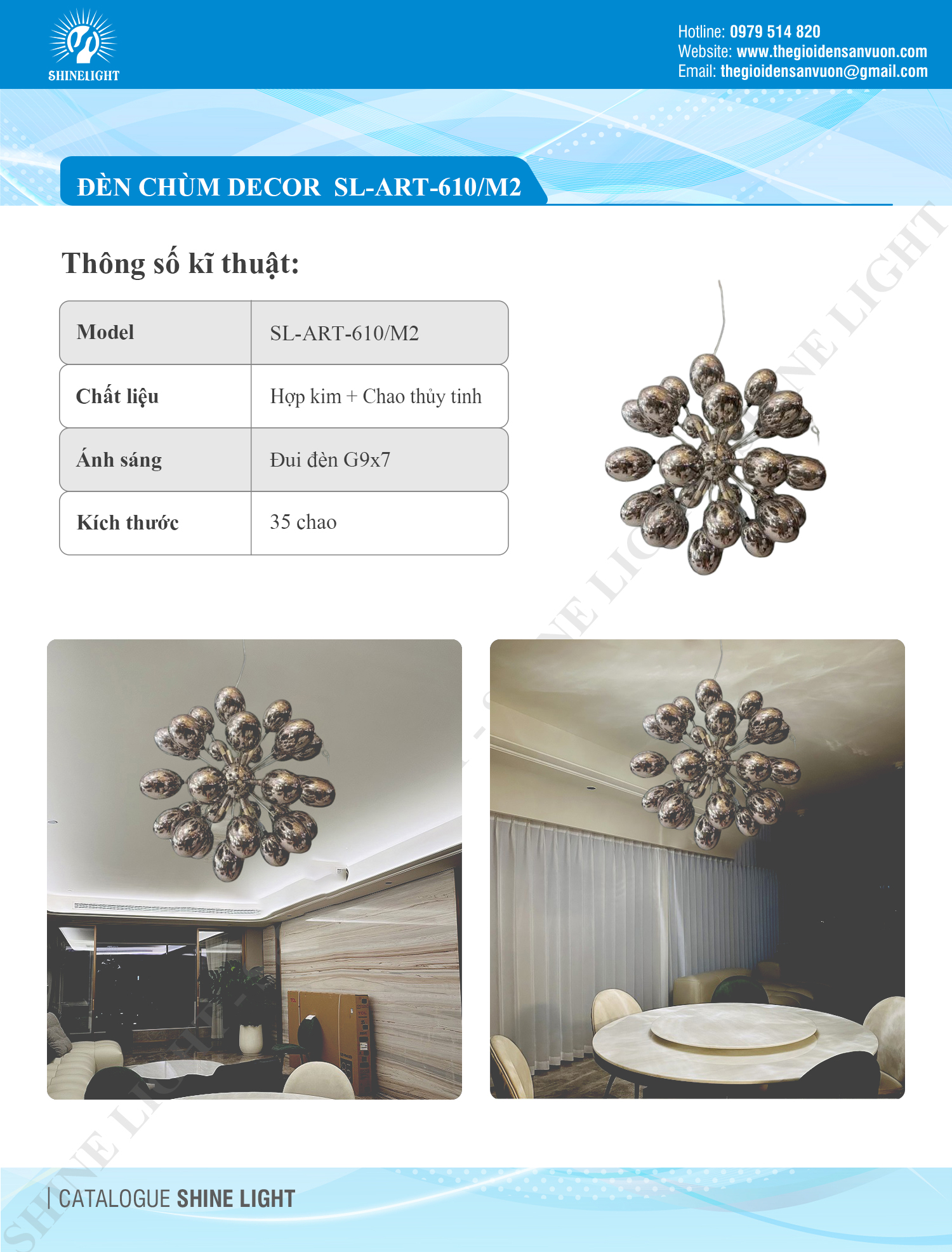 Với thiết kế 35 chao đèn sắp xếp uyển chuyển trên khung hợp kim mạ crom sáng bóng, ART-610/M2 tạo nên một tổng thể hoành tráng nhưng không nặng nề. Các chao được bố trí theo tầng và phân nhánh tựa như chùm hoa nở rộ giữa không gian, mang đến vẻ đẹp đầy nghệ thuật.