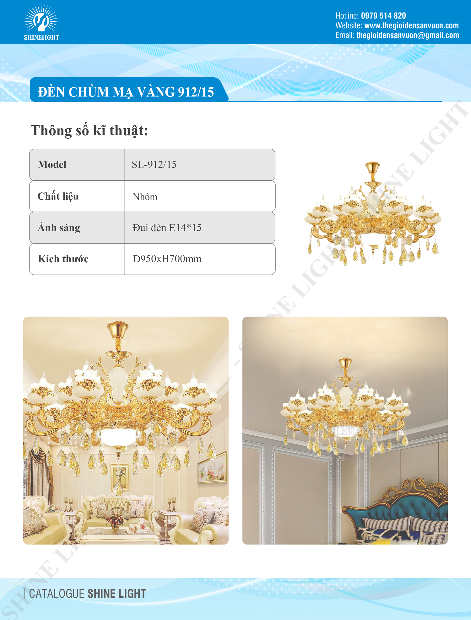 CHÙM MẠ VÀNG 912/15 không chỉ là một thiết bị chiếu sáng, mà còn là một tác phẩm nghệ thuật kết hợp hoàn hảo giữa vẻ đẹp sang trọng và công năng bền bỉ. Sở hữu sản phẩm này, bạn sẽ có được một không gian sống đẳng cấp, thể hiện rõ gu thẩm mỹ và phong cách riêng.