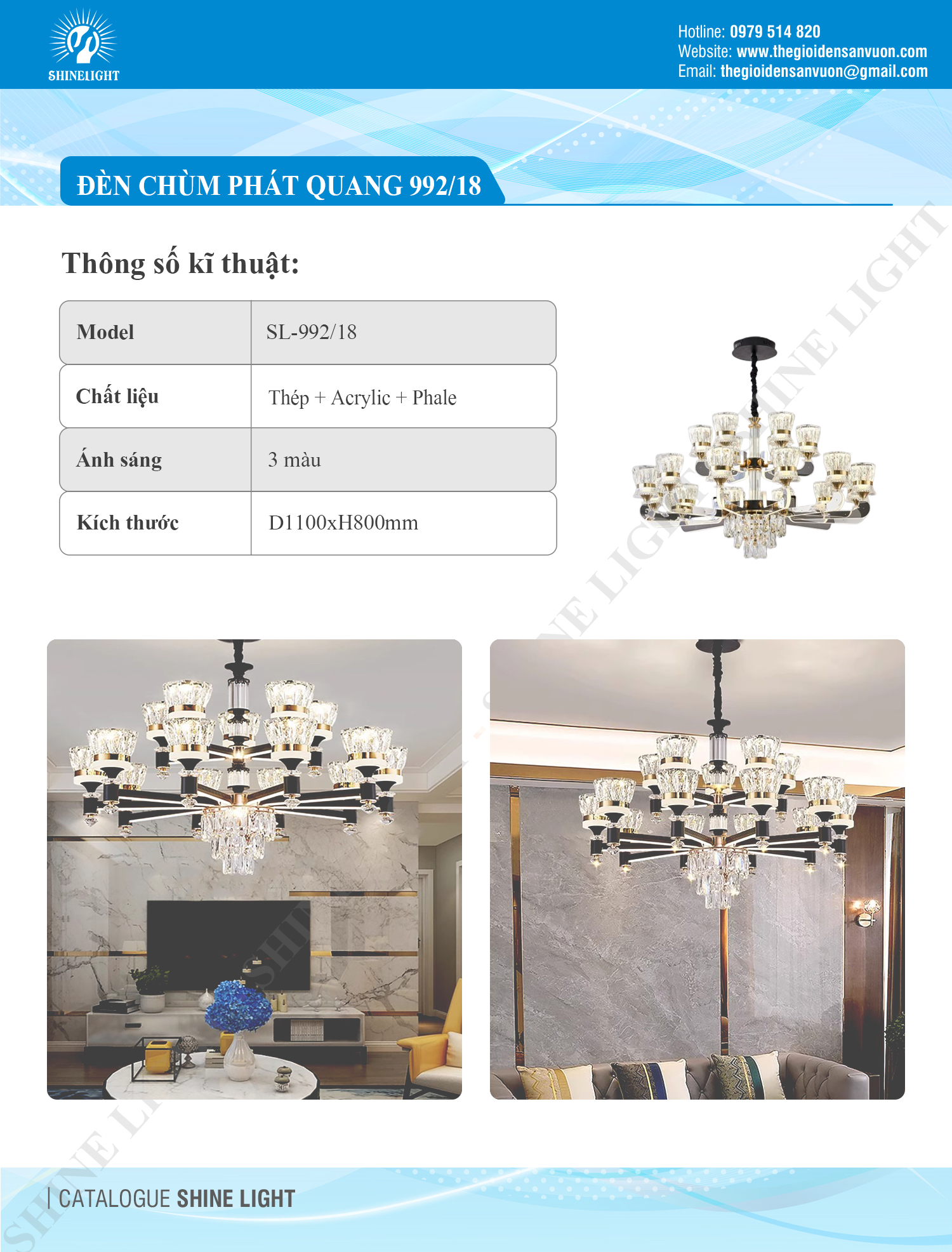CHÙM PHÁT QUANG 992/18 không chỉ là thiết bị chiếu sáng, mà còn là tác phẩm nghệ thuật nâng tầm giá trị không gian. Với thiết kế tinh tế, chất liệu cao cấp và tính năng chiếu sáng linh hoạt, đây là lựa chọn hoàn hảo cho những ai muốn kết hợp sự tiện nghi và thẩm mỹ trong cùng một sản phẩm.