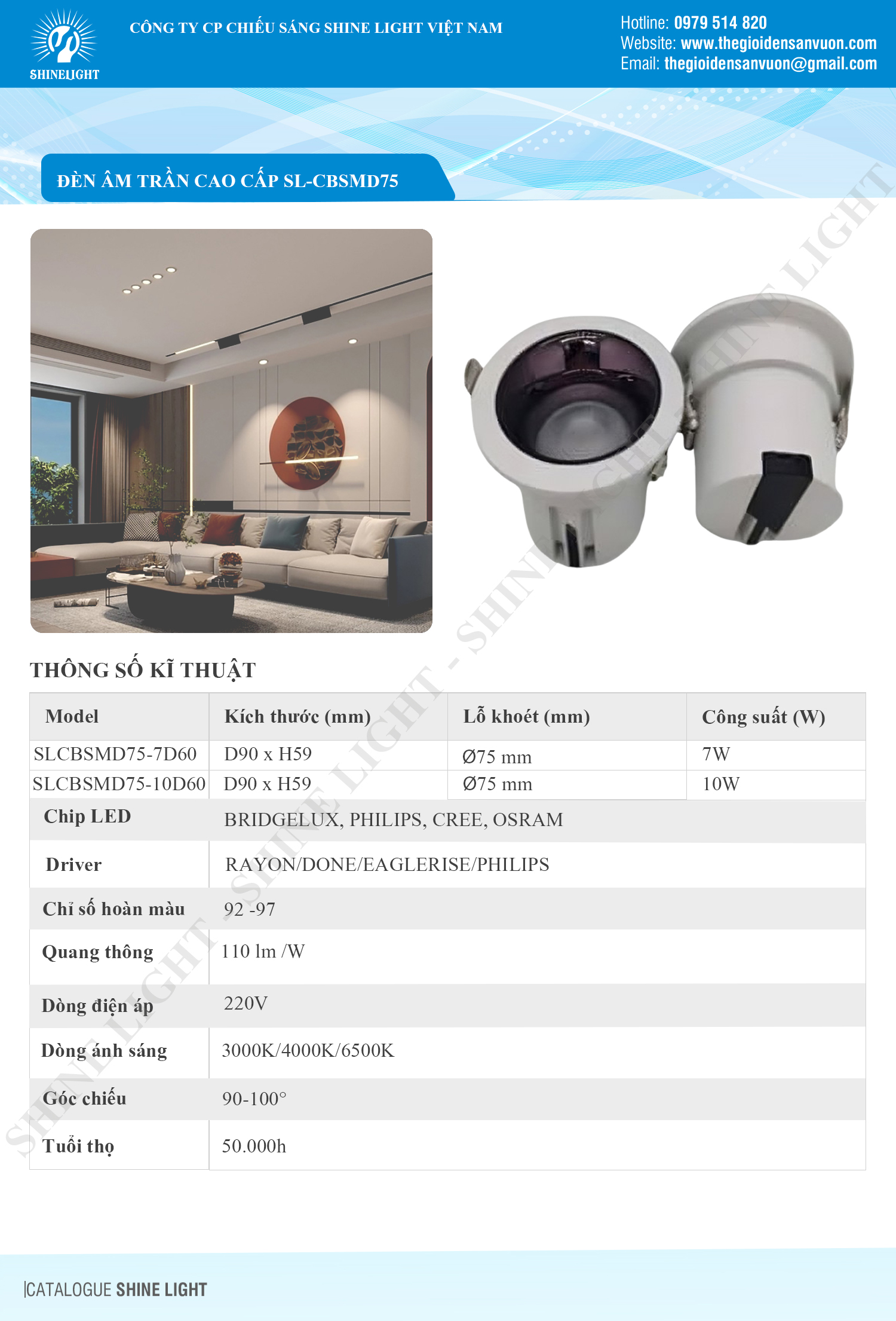 1. Thông số kỹ thuật của đèn downlight âm trần CBSMD75