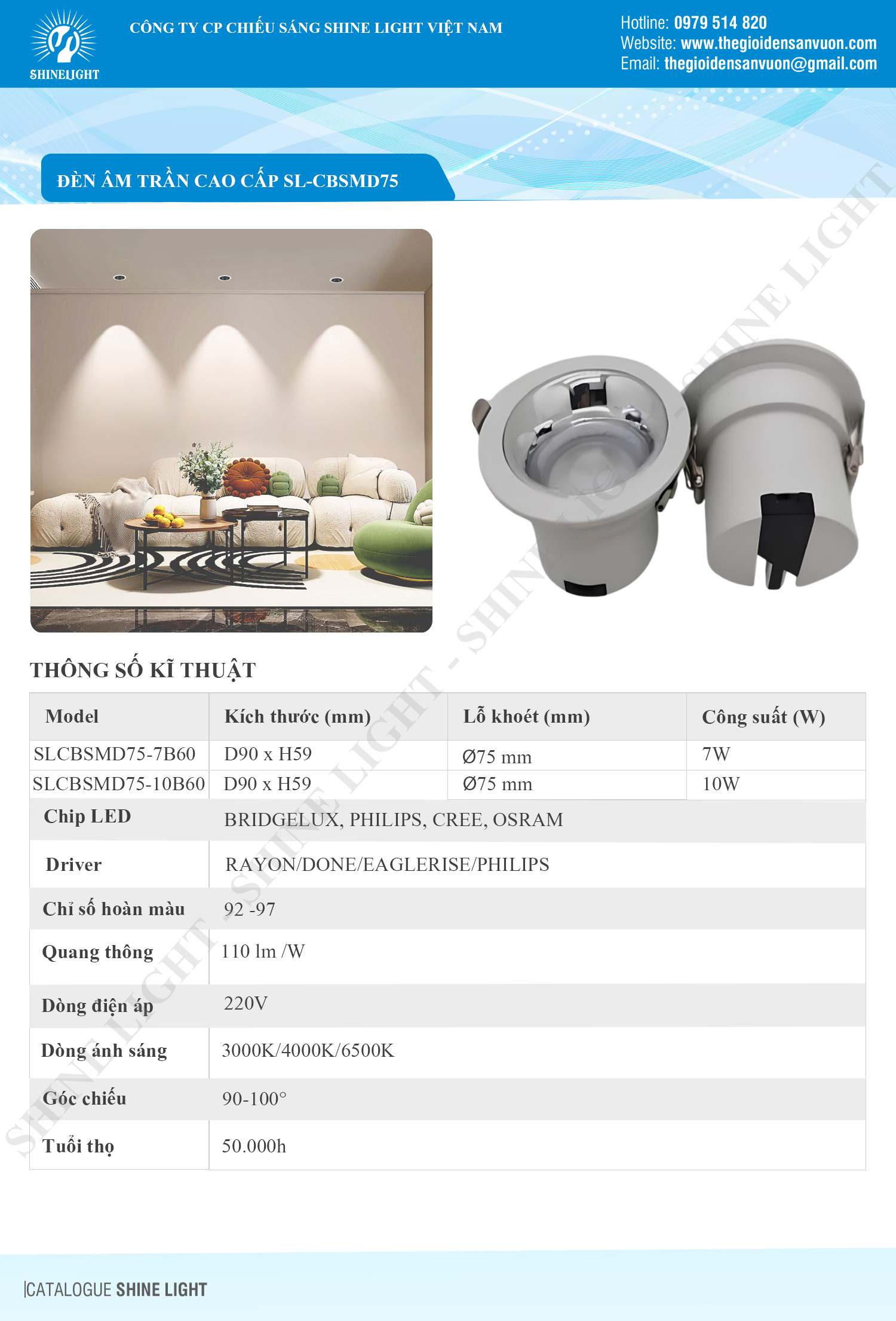 - Thiết Kế Sang Trọng, Chống Chói Hiệu Quả: Với lớp viền chống chói ánh vàng cao cấp, CBSMD75 phù hợp cho các không gian sang trọng, mang lại ánh sáng ấm áp nhưng không gây lóa mắt.