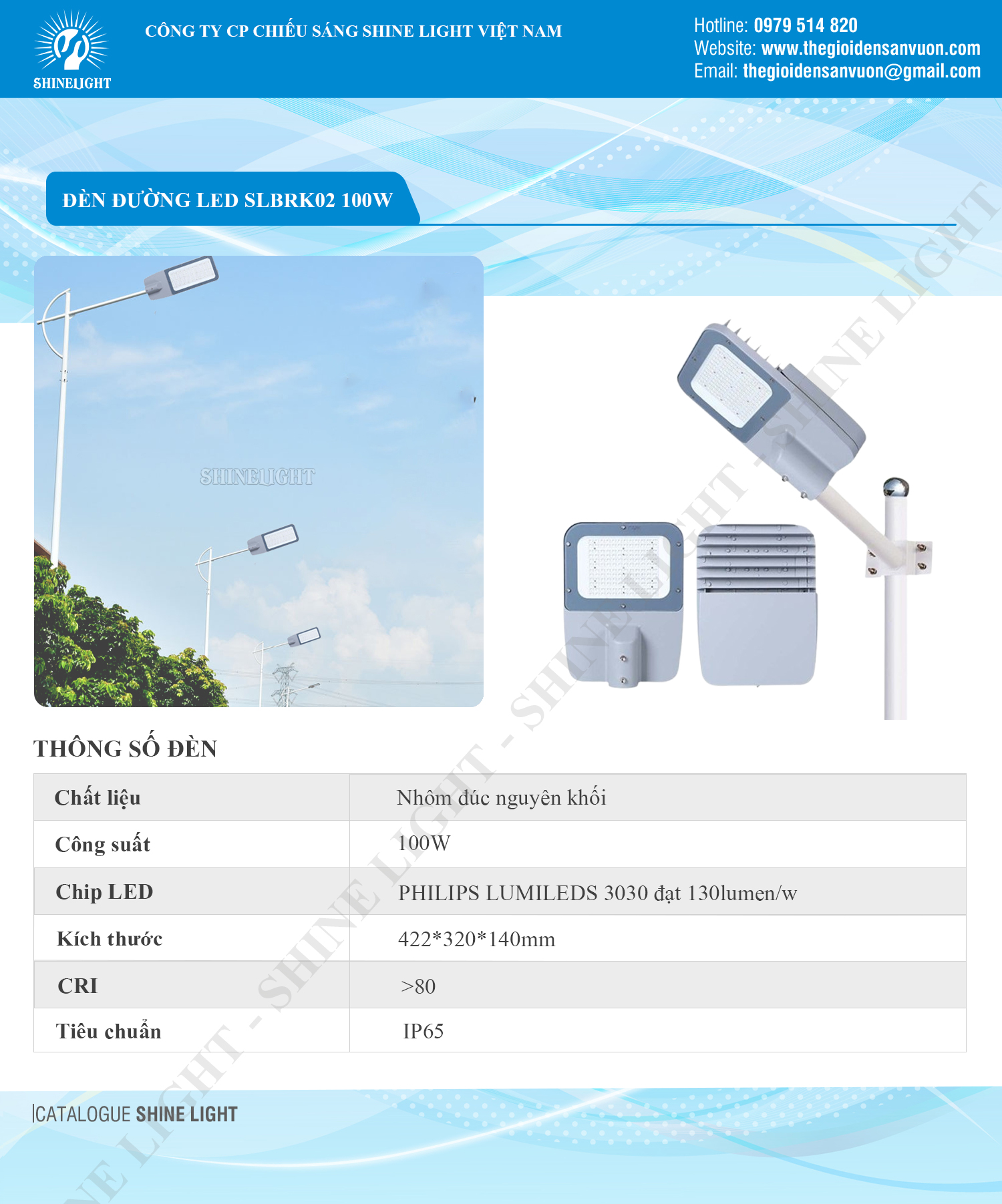 Đèn đường LED SLBRK02 100W là lựa chọn lý tưởng cho các công trình chiếu sáng ngoài trời, kết hợp giữa hiệu suất chiếu sáng tối ưu, thiết kế chắc chắn và khả năng tiết kiệm điện năng, giúp nâng cao chất lượng chiếu sáng đô thị và tiết kiệm chi phí vận hành.