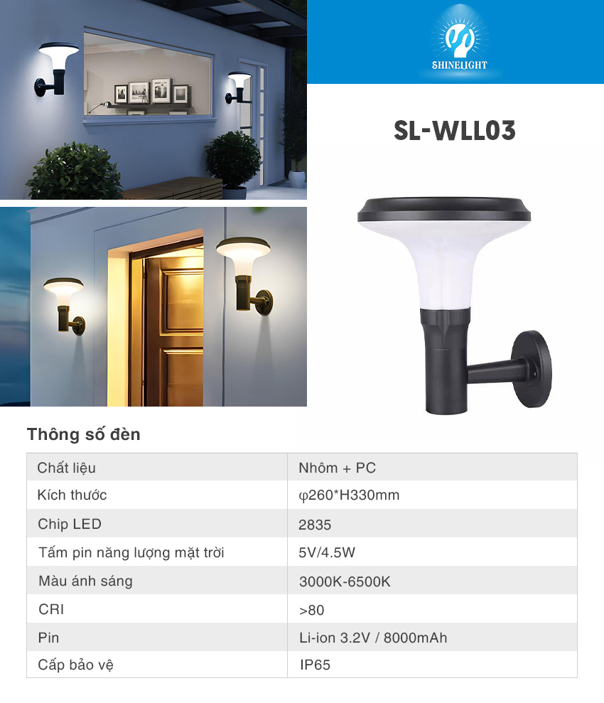– Đèn ngắn tường năng lượng mặt trời SL-WLL03 là dòng đèn NLMT cao cấp, sử dụng năng lượng mặt trời để phát sáng thông qua cơ chế chuyển hóa năng lượng từ ánh sáng mặt trời thành điện năng.