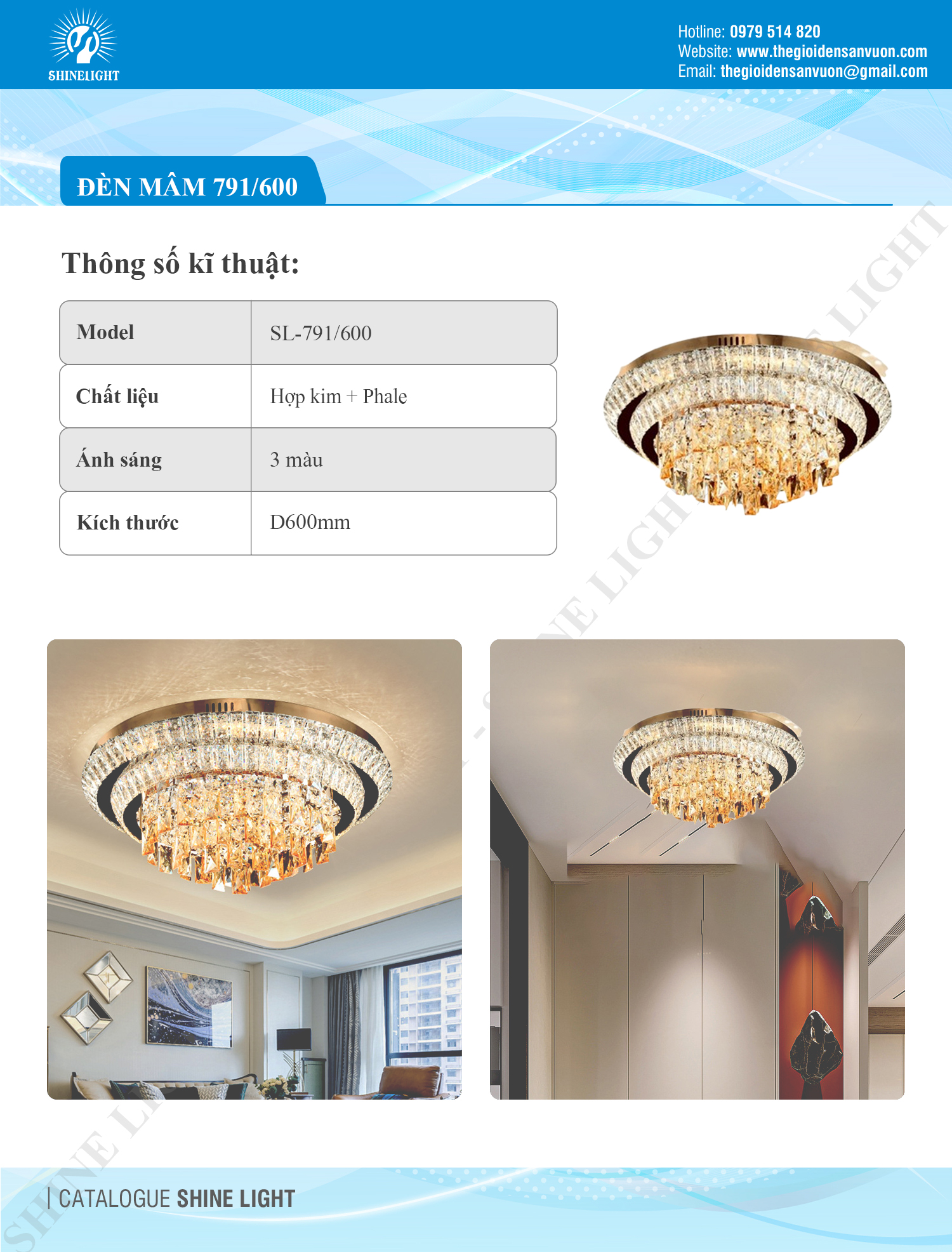 Không chỉ là nguồn sáng, Mâm 791/600 còn là chi tiết trang trí giúp tôn lên phong cách nội thất, đặc biệt phù hợp với những không gian hiện đại, tân cổ điển hoặc sang trọng. Đây là sự kết hợp hoàn hảo giữa công năng và nghệ thuật, mang đến giá trị sử dụng lâu dài.