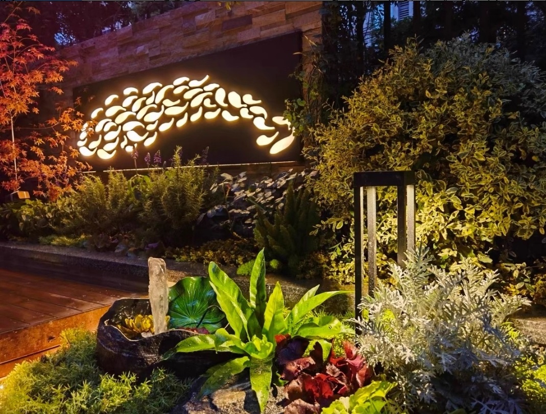 – Ánh sáng chiếu xuống tập trung, giúp làm nổi bật mảng cỏ, đá hoặc lối đi mà vẫn giữ sự ấm cúng, thư giãn.