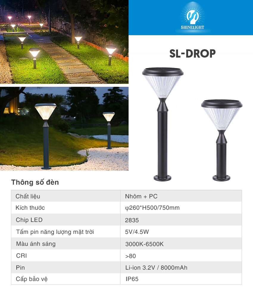 – Đèn nấm sân vườn năng lượng mặt trời SL-DROP là dòng đèn NLMT cao cấp, sử dụng năng lượng mặt trời để phát sáng thông qua cơ chế chuyển hóa năng lượng từ ánh sáng mặt trời thành điện năng.
