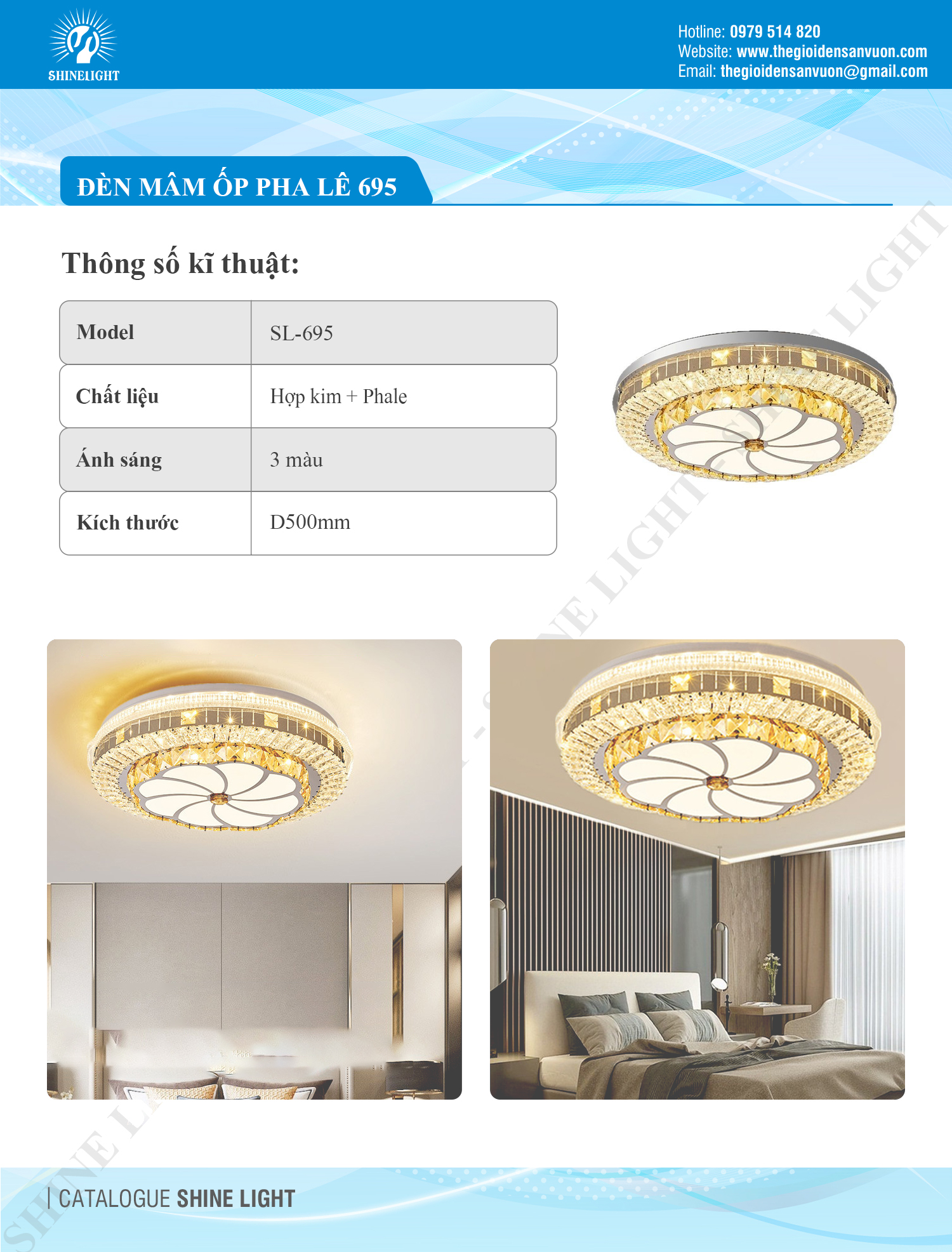 ỐP PHA LÊ 695 không chỉ là một chiếc đèn trần đơn thuần, mà là “nghệ thuật ánh sáng” kết hợp hoàn hảo giữa thiết kế, chất liệu và tính năng. Với phong cách hiện đại, chất liệu cao cấp, ánh sáng đa dạng và khả năng tiết kiệm năng lượng, sản phẩm là lựa chọn lý tưởng cho mọi gia đình, doanh nghiệp muốn nâng tầm không gian sống và làm việc.