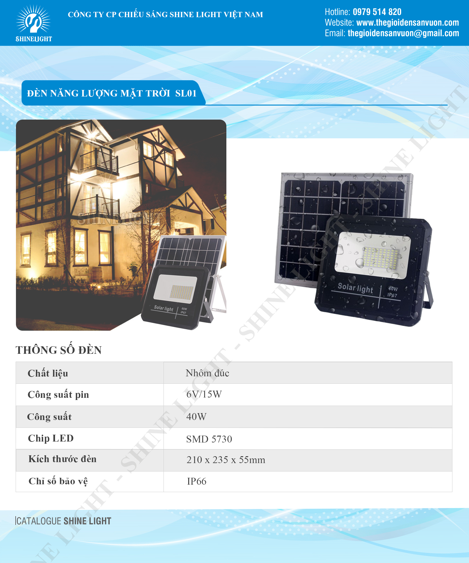 Đèn pha năng lượng mặt trời SL01-40W là thiết bị chiếu sáng tiên tiến sử dụng năng lượng mặt trời, giúp tiết kiệm điện năng, thân thiện với môi trường và đảm bảo an toàn tuyệt đối cho người sử dụng. Sản phẩm lý tưởng để chiếu sáng sân vườn, cổng nhà, công viên, lối đi, khu dân cư và các khu vực ngoài trời.