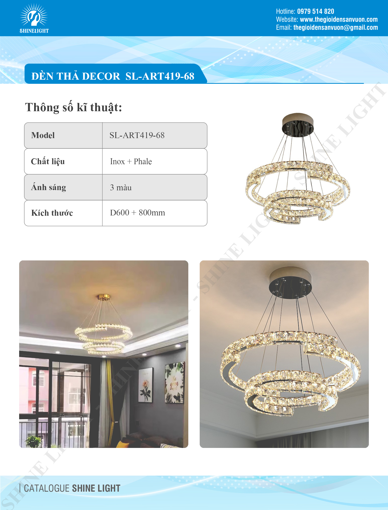 Không chỉ đơn thuần là thiết bị chiếu sáng, ĐÈN THẢ DECOR ART419-68 còn là một điểm nhấn nghệ thuật tinh tế, giúp nâng tầm không gian nội thất. Sự kết hợp giữa thiết kế đa tầng, chất liệu cao cấp và ánh sáng 3 màu mang đến trải nghiệm thị giác ấn tượng cho bất kỳ ai bước vào không gian của bạn.