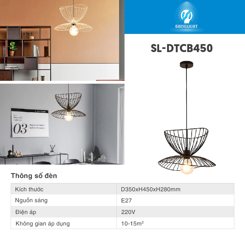 Đèn thả trang trí SL-DTCB450 là một loại đèn được treo thả từ trần nhà xuống bằng một hoặc nhiều sợi cáp. Đèn thả có nhiều kiểu dáng, mẫu mã đa dạng, từ cổ điển đến hiện đại, từ đơn giản đến cầu kỳ, đáp ứng được mọi nhu cầu và sở thích của người dùng.