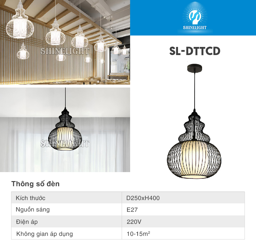 Đèn thả trang trí SL-DTTCD là một loại đèn được treo thả từ trần nhà xuống bằng một hoặc nhiều sợi cáp. Đèn thả có nhiều kiểu dáng, mẫu mã đa dạng, từ cổ điển đến hiện đại, từ đơn giản đến cầu kỳ, đáp ứng được mọi nhu cầu và sở thích của người dùng.
