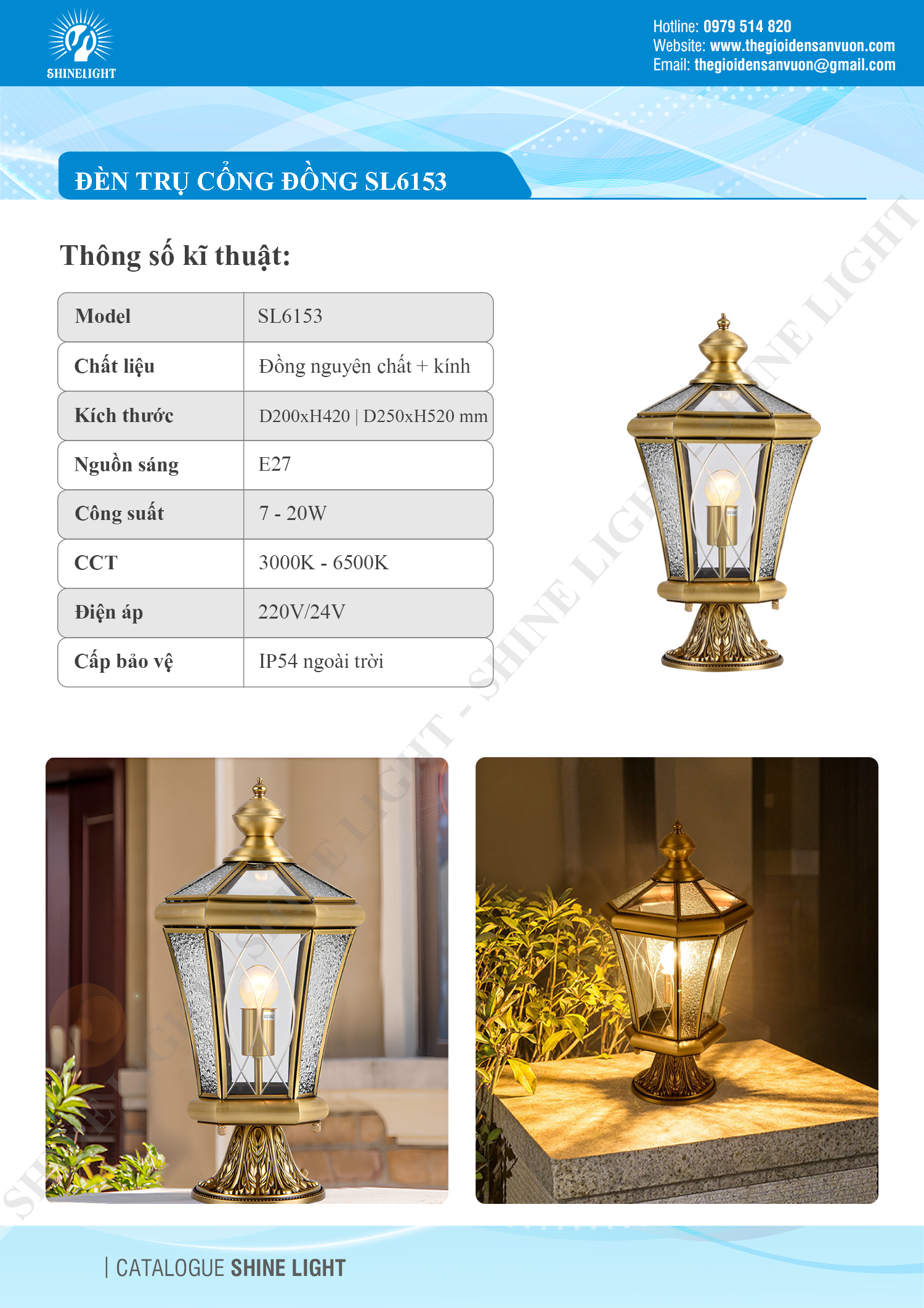 - Dễ dàng lắp đặt và bảo trì: Đèn trụ cổng đồng SL6153 được thiết kế đơn giản, dễ dàng lắp đặt và bảo trì.