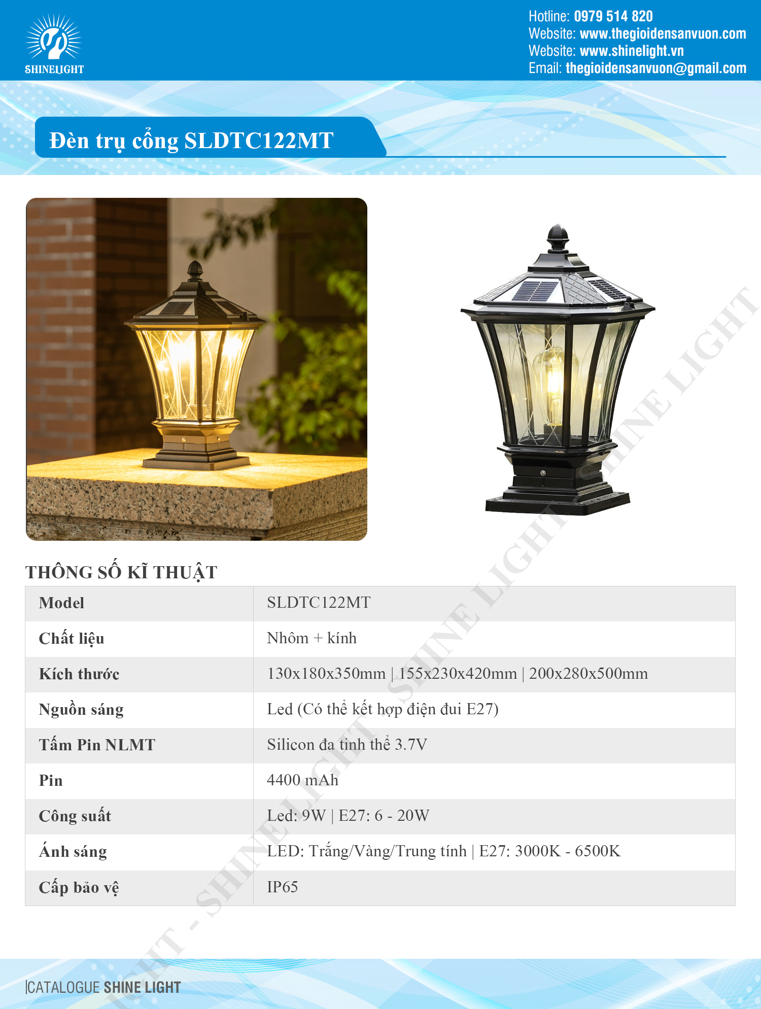 SL-DTC122MT là mẫu đèn trụ cổng thông minh, kết hợp tinh tế giữa thẩm mỹ cổ điển và công nghệ năng lượng mặt trời hiện đại, mang đến sự bền bỉ, tiết kiệm và sang trọng cho công trình.