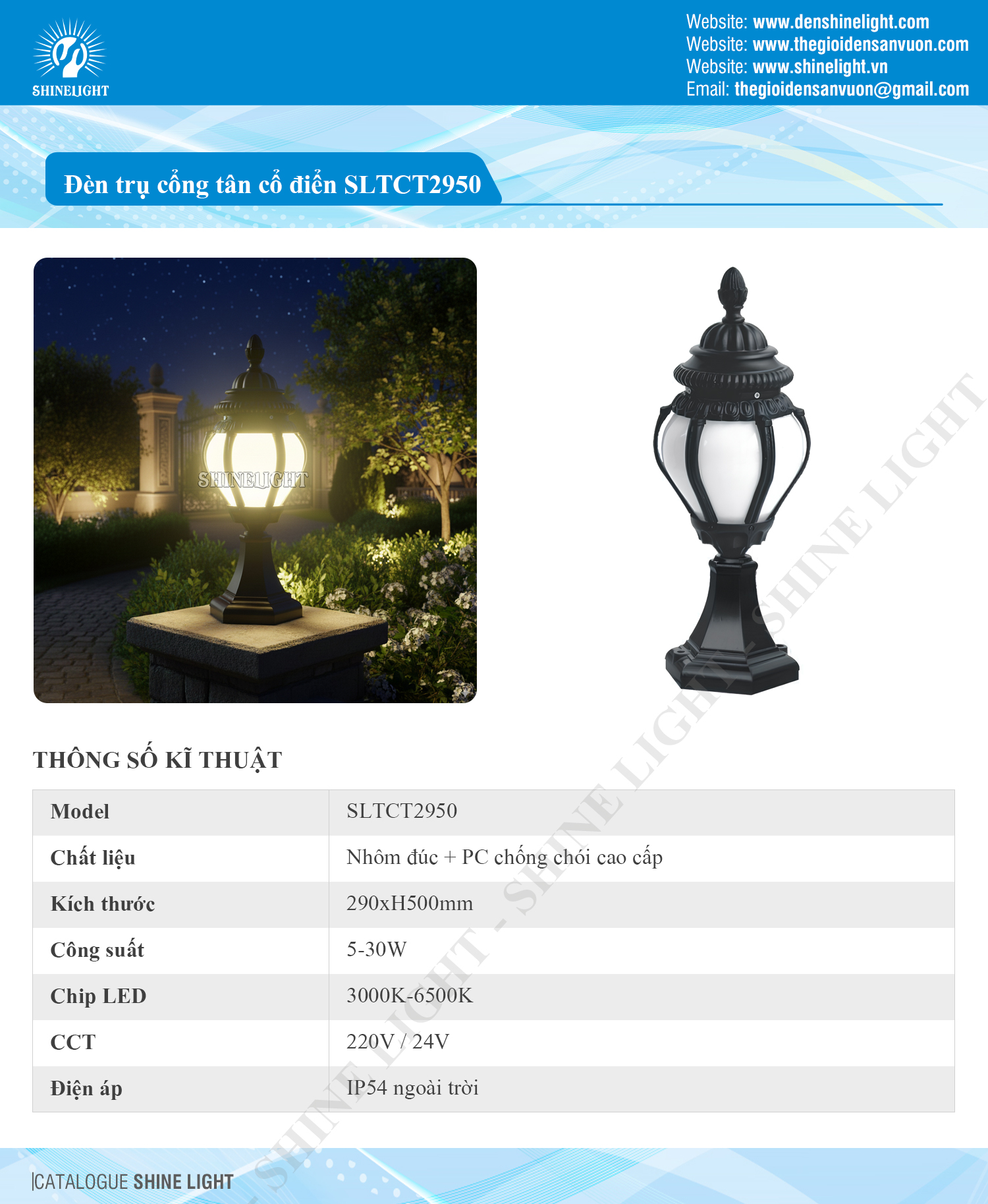 Nếu bạn đang tìm kiếm một mẫu đèn trụ cổng vừa mang vẻ đẹp tân cổ điển tinh tế, vừa đáp ứng các tiêu chí về độ bền và tiết kiệm năng lượng, SLTCT2950 chính là giải pháp hoàn hảo. Sản phẩm không chỉ chiếu sáng lối ra vào mà còn biến cổng nhà trở thành tác phẩm nghệ thuật ánh sáng, giúp không gian ngoại thất của bạn luôn nổi bật và cuốn hút, kể cả khi đêm xuống.