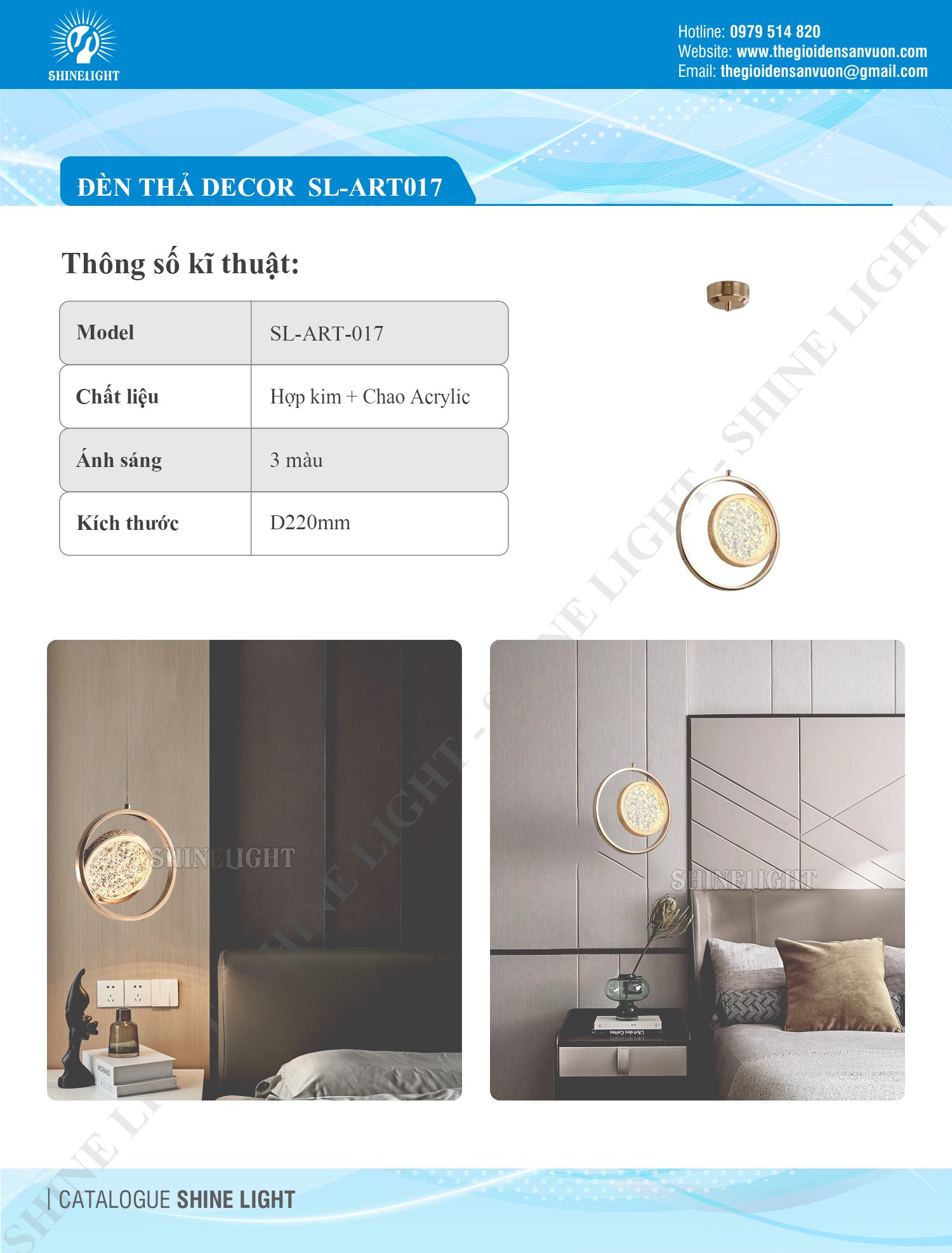 Với đường kính D220mm, ART017 sở hữu kiểu dáng tròn tinh tế, tạo cảm giác mềm mại nhưng vẫn hiện đại. Thân đèn được làm từ hợp kim cao cấp, chắc chắn, chống gỉ sét, giữ được độ sáng đẹp bền lâu. Chao đèn Acrylic trong suốt, gia công tỉ mỉ, giúp ánh sáng lan tỏa đều, tạo hiệu ứng chiếu sáng mềm mại, dễ chịu cho mắt.