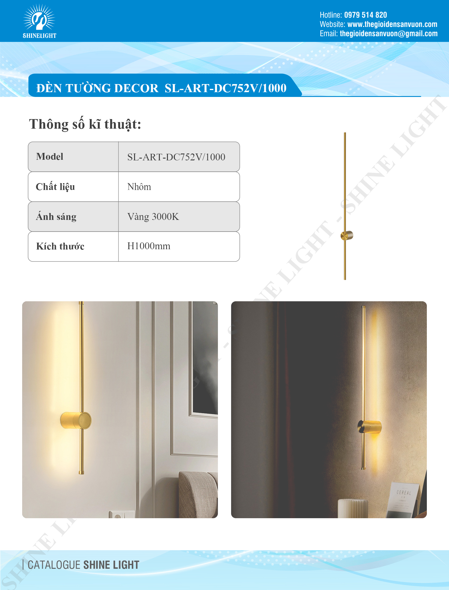 Với chiều cao H1000mm, ART-DC752V/1000 sở hữu thiết kế dài thanh thoát, mang đến sự nổi bật cho bất kỳ bức tường nào. Thân đèn bằng nhôm cao cấp, phủ sơn màu vàng sang trọng, chống oxy hóa, hạn chế bám bụi và dễ vệ sinh, giữ được vẻ sáng mới lâu dài.