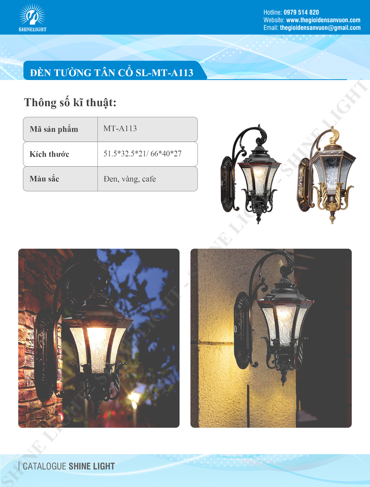 SL-MT-A113 mang đậm dấu ấn thiết kế tân cổ, với kiểu dáng đèn lồng gắn tường kết hợp hoa văn uốn lượn tinh tế. Chân đế, khung đèn và các chi tiết uốn cong được chế tác tỉ mỉ, tạo điểm nhấn sang trọng, nâng tầm giá trị thẩm mỹ cho tổng thể công trình.
